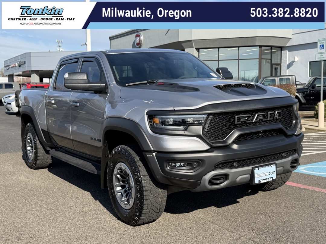 Clean CARFAX. 2021 Ram 1500 TRX 6.2L Supercharged HEMI V8 SRT 8-Speed Automatic 4WD 4D Crew Cab Billet Silver Metallic Clearcoat 1500 TRX, 4WD, 4 Way Front Headrests, Adaptive Cruise Control w/Stop & Go, Advanced Safety Group, Blind Spot & Cross Path Detection, Body Color Door Handles, Bucket Seats, Dome Dual LED Reading Lamp, Driver Seat Memory, Driver/Passenger Wrapped Assist Handles, Dual-Pane Panoramic Sunroof, Exterior Mirrors w/Memory, Front Door Accent Lighting, Full Length Premium Upgraded Floor Console, Heated Front Seats, Heated Second Row Seats, Heated Steering Wheel, IP LED Ambient Light Pipe, Lane Keep Assist, Leather Trimmed Bucket Seats, Leather/Suede Flat-Bottom Steering Wheel, Luxury Front Door Trim Panel, Navigation System, ParkSense Front/Rear Park Assist w/Stop, Pedestrian Emergency Braking, Pick-Up Box Lighting, Power 4-Way Driver Lumbar Adjust, Power 4-Way Passenger Lumbar Adjust, Power 8-Way Driver & Passenger Seats, Power Adjustable Pedals w/Memory, Premium Wrapped IP Bezel, Quick Order Package 29Y, Radio/Driver Seat/Mirrors/Pedals Memory, Rain Sensitive Windshield Wipers, Rear 60/40 Folding Split Recline Seat, Rear Door Accent Lighting, Rear Underseat Compartment Storage, Rear Window Defroster, Remote Proximity Keyless Entry, Remote Start System, Remote Tailgate Release, Sun Visors w/Illuminated Vanity Mirrors, Surround View Camera System, Trailer Brake Control, Trailer Light Check, Trailer Tire Pressure Monitoring System, Trailer Tow Group, TRX Level 2 Equipment Group, Universal Garage Door Opener, Ventilated Front Seats, Ventilated Rear Seats, Wireless Charging Pad, 10 Speakers, 3.55 Rear Axle Ratio, 4-Wheel Disc Brakes, ABS brakes, Adaptive suspension, Air Conditioning, AM/FM radio: SiriusXM with 360L, Apple CarPlay/Android Auto, Auto High-beam Headlights, Auto-dimming door mirrors, Auto-dimming Rear-View mirror, Automatic temperature control, Black Exterior Mirrors, Black Power-Fold Trailer Tow Mirrors, Brake assist, Cloth/Vinyl Bucket Seats, Compass, Custom Fuel Wheels and Off-Road Tires, Delay-off headlights, Driver door bin, Dual front impact airbags, Dual front side impact airbags, Electronic Stability Control, Emergency communication system: SiriusXM Guardian, Exterior Mirrors Courtesy Lamps, Exterior Mirrors w/Heating Element, Exterior Mirrors w/Supplemental Signals, Front anti-roll bar, Front Bucket Seats, Front Center Armrest w/Storage, Front dual zone A/C, Front fog lights, Front License Plate Bracket, Front reading lights, Front wheel independent suspension, Fully automatic headlights, harman/kardon 19 Speaker Premium Sound, Heated door mirrors, Illuminated entry, Leather Shift Knob, Leather steering wheel, Low tire pressure warning, Manufacturer's Statement of Origin, Mirror Clearance/Running Lights, Mirror-Mounted Aux Reverse Lamps, Occupant sensing airbag, Outside temperature display, Overhead airbag, Overhead console, Panic alarm, ParkView Rear Back-Up Camera, Passenger door bin, Passenger vanity mirror, Power door mirrors, Power driver seat, Power steering, Power windows, Power-Folding Mirrors, Radio data system, Radio: Uconnect 12 w/Navigation, Rear seat center armrest, Rear step bumper, Remote keyless entry, Security system, Speed control, Split folding rear seat, Sport steering wheel, Steering wheel mounted audio controls, Tachometer, Telescoping steering wheel, Tilt steering wheel, Traction control, Trailer Reverse Steering Control, Trailer Tow Mirrors, Trip computer, Turn signal indicator mirrors, Variably intermittent wipers, Voltmeter, Wheels: 18" x 9" Bead-Lock Aluminum, Wheels: 18" x 9" Black Paint/Polish Aluminum, 1500 TRX, 4WD, 4 Way Front Headrests, Adaptive Cruise Control w/Stop & Go, Advanced Safety Group, Blind Spot & Cross Path Detection, Body Color Door Handles, Bucket Seats, Dome Dual LED Reading Lamp, Driver Seat Memory, Driver/Passenger Wrapped Assist Handles, Dual-Pane Panoramic Sunroof, Exterior Mirrors w/Memory, Front Door Accent Lighting, Full Length Premium U